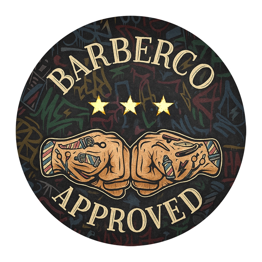 Stylová barber samolepka BARBERCO Approved z lesklého PVC. Průměr 10 cm, kulatý tvar. Ideální doplněk do každého barber shopu, na zrcadlo, dveře nebo pracovní stanici.