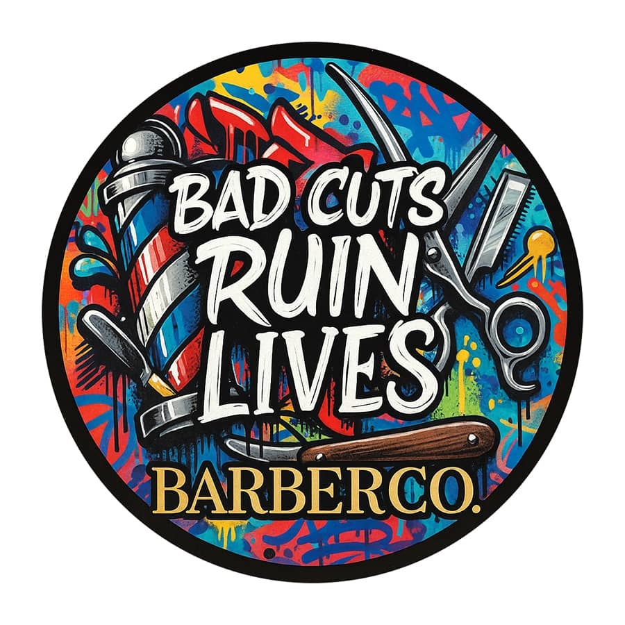 Stylová barber samolepka BARBERCO Bad cuts ruin lives z lesklého PVC. Průměr 10 cm, kulatý tvar. Ideální doplněk do každého barber shopu, na zrcadlo, dveře nebo pracovní stanici.