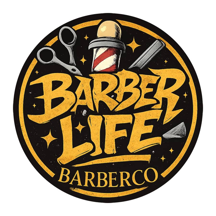 Stylová barber samolepka BARBERCO Barber life z lesklého PVC. Průměr 10 cm, kulatý tvar. Ideální doplněk do každého barber shopu, na zrcadlo, dveře nebo pracovní stanici.