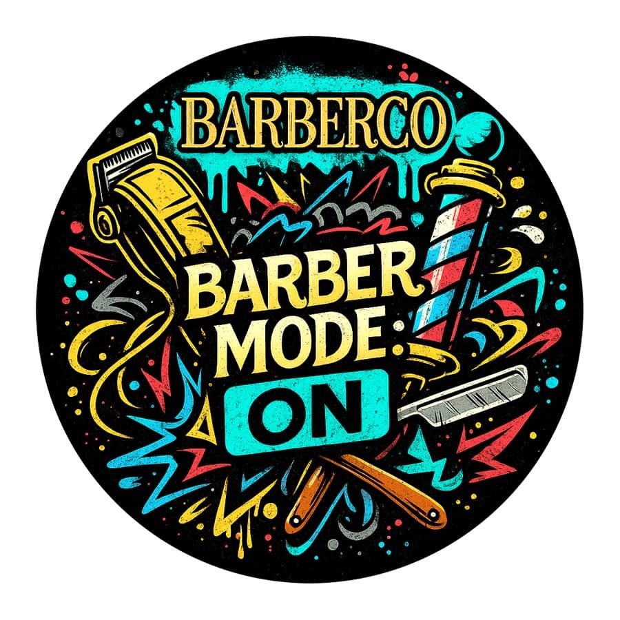 Stylová barber samolepka BARBERCO Barber mode: ON z lesklého PVC. Průměr 10 cm, kulatý tvar. Ideální doplněk do každého barber shopu, na zrcadlo, dveře nebo pracovní stanici.