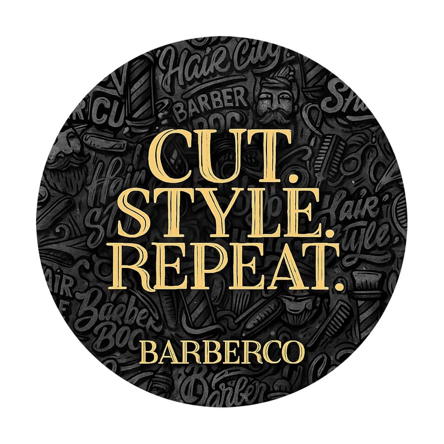 Stylová barber samolepka BARBERCO Cut. Style. Repeat. z lesklého PVC. Průměr 10 cm, kulatý tvar. Ideální doplněk do každého barber shopu, na zrcadlo, dveře nebo pracovní stanici.