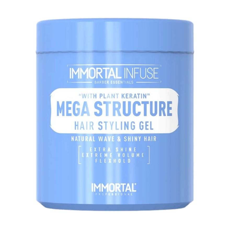 Immortal Mega Structure zajistí extra lesk, extrémní objem a flexibilní fixaci. S rostlinnými extrakty, modrý design. Pro stylování vlasů.
