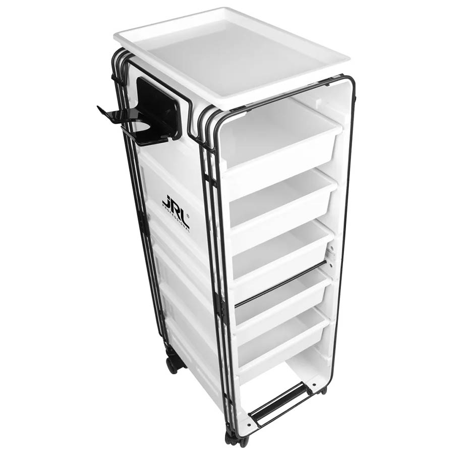 Elegantní bílý barber stolek na kolečkách od populární značky JRL Professional ideální pro uložení kadeřnického vybavení v barber shopu či kadeřnictví. Součástí je 5 šuplíků a držák na fén.