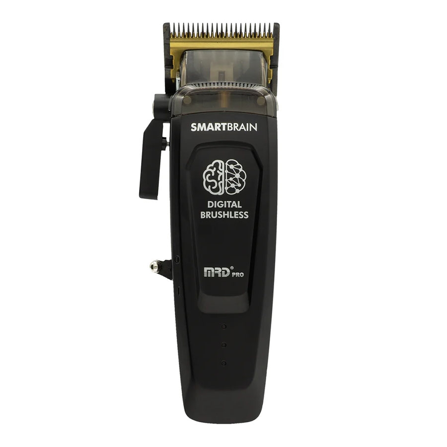 Profesionální střihací strojek na vlasy MRD Pro Smart Brain clipper HC-90-4 Black s výkonným bezkartáčovým DC motorem s 7200 ot./min., DLC ECHO čepelí a až 2,5 h provozu. Kovové tělo, USB-C nabíjení a magnetické nástavce. Maximální přesnost a top výkon pro barber shop.