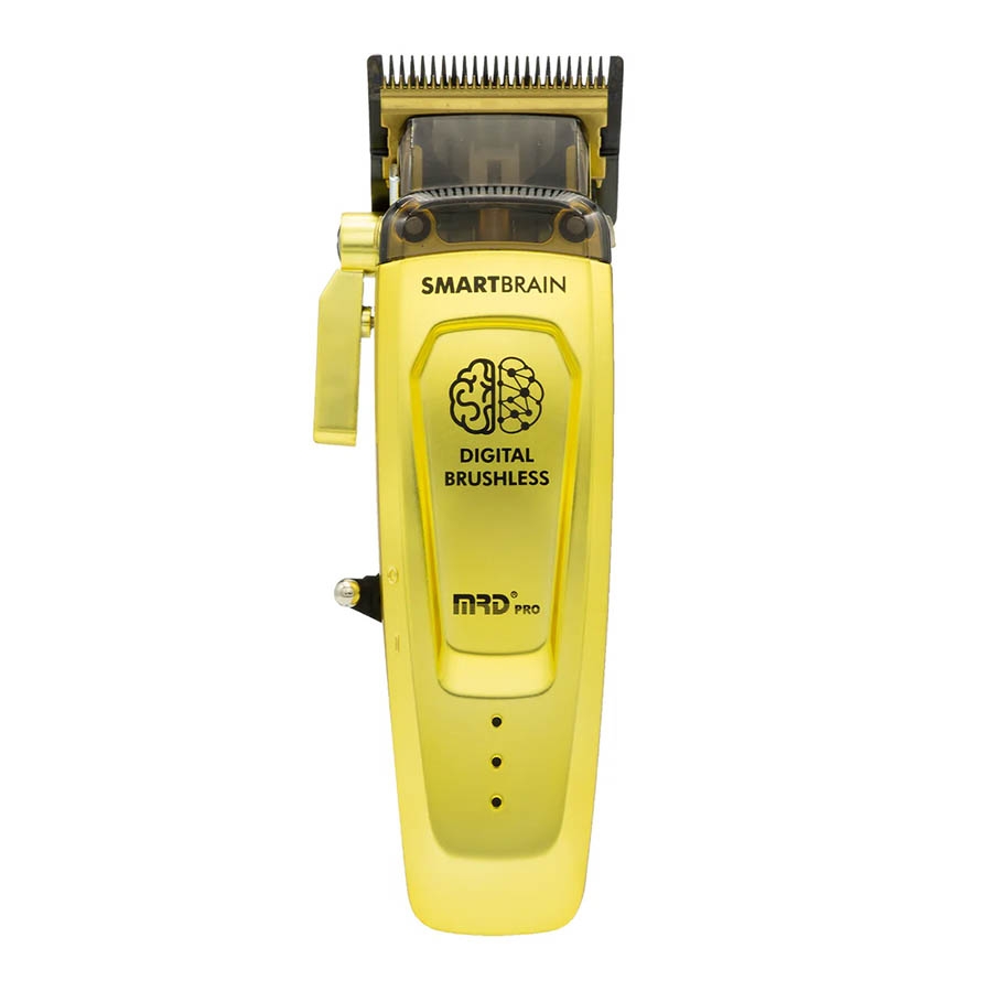 Profesionální střihací strojek na vlasy MRD Pro Smart Brain clipper HC-90-4 Gold s výkonným bezkartáčovým DC motorem s 7200 ot./min., DLC ECHO čepelí a až 2,5 h provozu. Kovové tělo, USB-C nabíjení a magnetické nástavce. Maximální přesnost a top výkon pro barber shop.